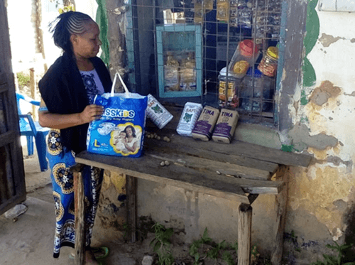 Det här är Christine, en av medlemmarna i projektet. Hon äger ett skrädderi och en butik och hoppas lära sig mer om sparande, företagsledning och bokföring. Hon har ett lager och en symaskin och hennes inkomst är 80 kr per månad – en inkomst som långt ifrån räcker till för att försörja en familj med tre barn.